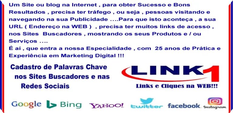Um Site ou blog na Internet , para obter Sucesso e Bons Resultados , precisa ter tráfego , ou seja , pessoas visitando e navegando na sua Publicidade ….Para que isto aconteça , a sua URL ( Endereço na WEB ) , precisa ter muitos links de acesso , nos Sites Buscadores , mostrando os seus Produtos e / ou Serviços …. É aí , que entra a nossa Especialidade , com 20 anos de Prática e Experiência em Marketing Digital !!!